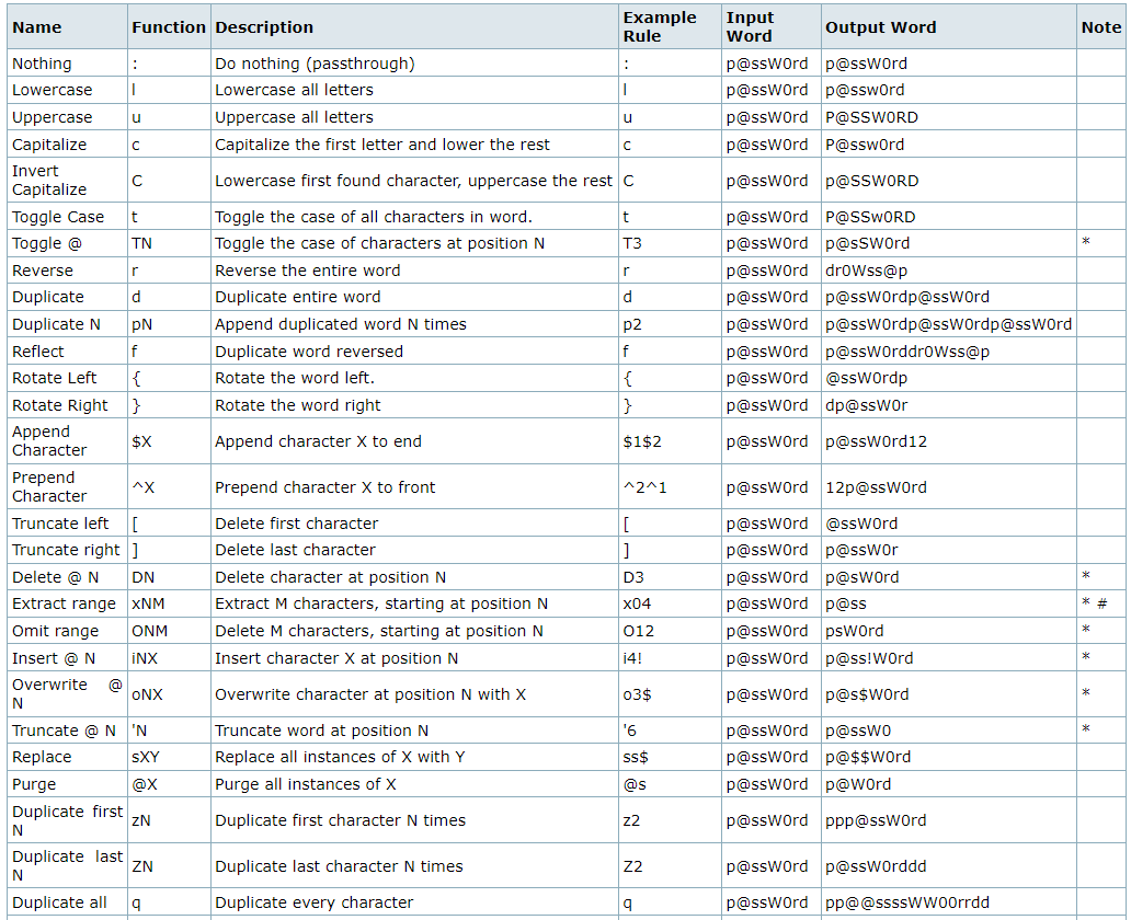 目前除了 M(Memorize)的规则已经全部实现. 并且去掉了 hashcat 的一些限制, 比如最多支持 5 个规则, 字符串长度不能大于 10 等.